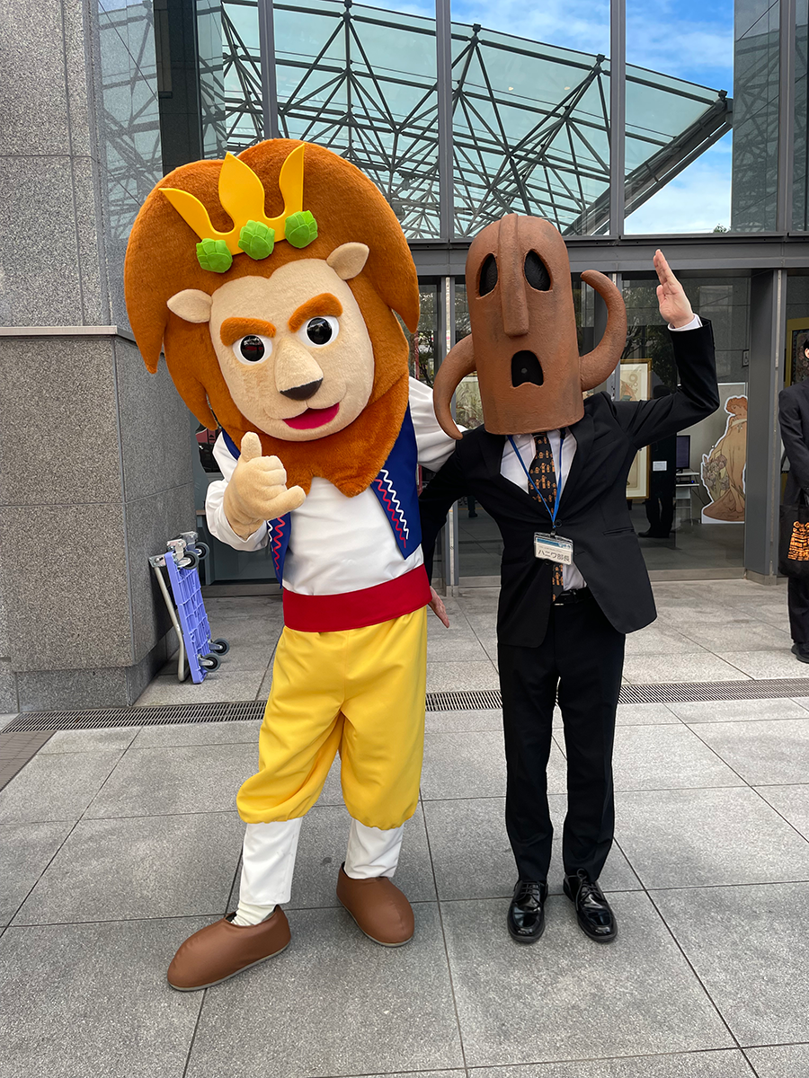 麻生さんにメールで事前連絡したとき、その到着時間だとライオンのアテンドでブースを離れているかもしれないとのことだった。ライオンのアテンドってなんだ? 実際に行ってみると、チェコ観光局マスコットのレフ丸の着ぐるみが歩いていて、たしかにその横に麻生さんがいた。お疲れさまです。ちなみにレフ丸は写真左で、右は麻生さんではなく、堺市のゆるキャラ、ハニワ部長だ。