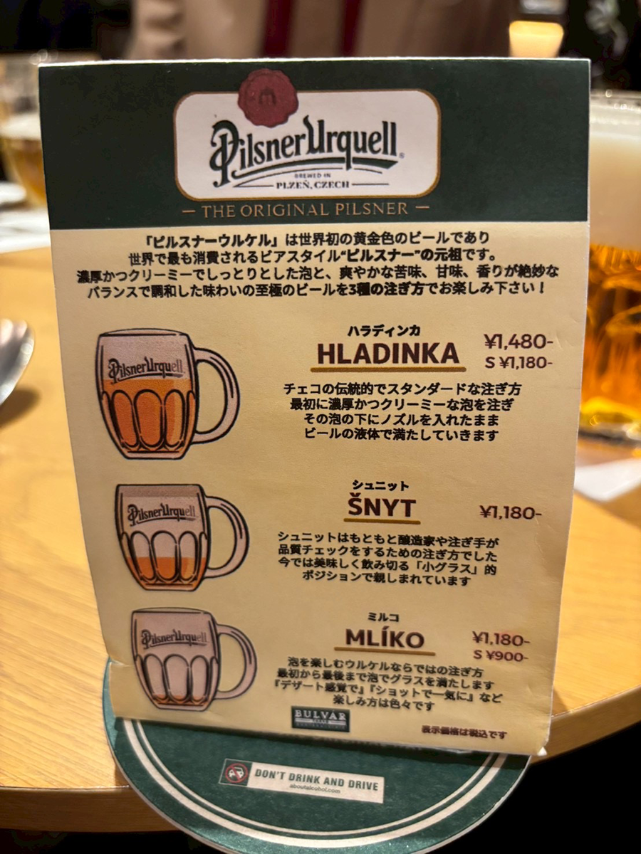 チェコ料理専門のレストランということもあって、ビールのつぎ方を3種類から選べるという。後日、実際にプラハへ行ってからも、この3種類を選べると表示されている店はあったし、表示されていないとしても、頼めば希望どおりにしてくれる店が多いとのことだった(何も言わなければ、上のハラディンカでつがれる)。