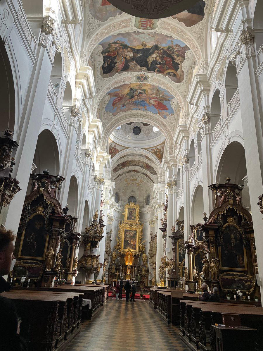 先ほど見た大聖堂の裏側にミサの案内表示がある。時間帯によって説教の言語が変わるらしい。チェコ語、英語とほかのいくつかのヨーロッパ言語だけでなく、フィリピン語という表示もあった。