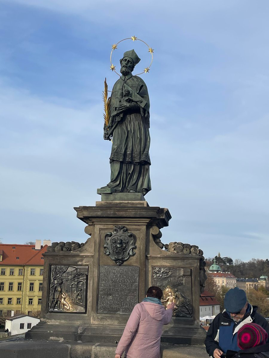 両側に並ぶ30体の彫像のうち、最も有名な聖ヤン・ネポムツキー(ネポムクのヨハネ)像のまわりには、さすがにたくさんの人がいる。頭上の五つ星が特徴(亡くなったときに5人の天使が天へ導いたと言われていて、その象徴だそうだ)。ヴァーツラフ4世の怒りを買って拷問を受け、遺体がカレル橋からヴルタヴァ川へ投げ捨てられたと言われていて、その場面を描いた絵が彫られたプレートも台座の右下にある。