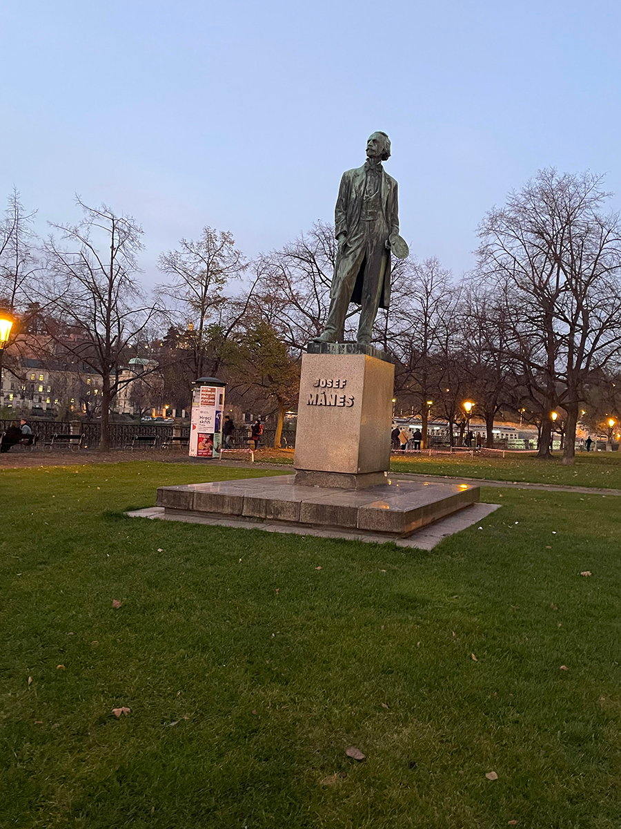 少し歩くと、ヨゼフ・マーネス像の前を通りかかる。チェコの国民的画家で、天文時計の装飾画を描いた人物であり、すぐ横のマーネス橋(SOSに何度も登場)の名前の由来にもなっている。