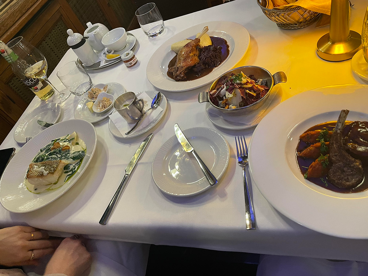ヴィートさんと3人で夕食。日本で市民会館の食堂というと、安い定食のたぐいを想像するが、ここはむしろ高級レストランの風格があって驚く。