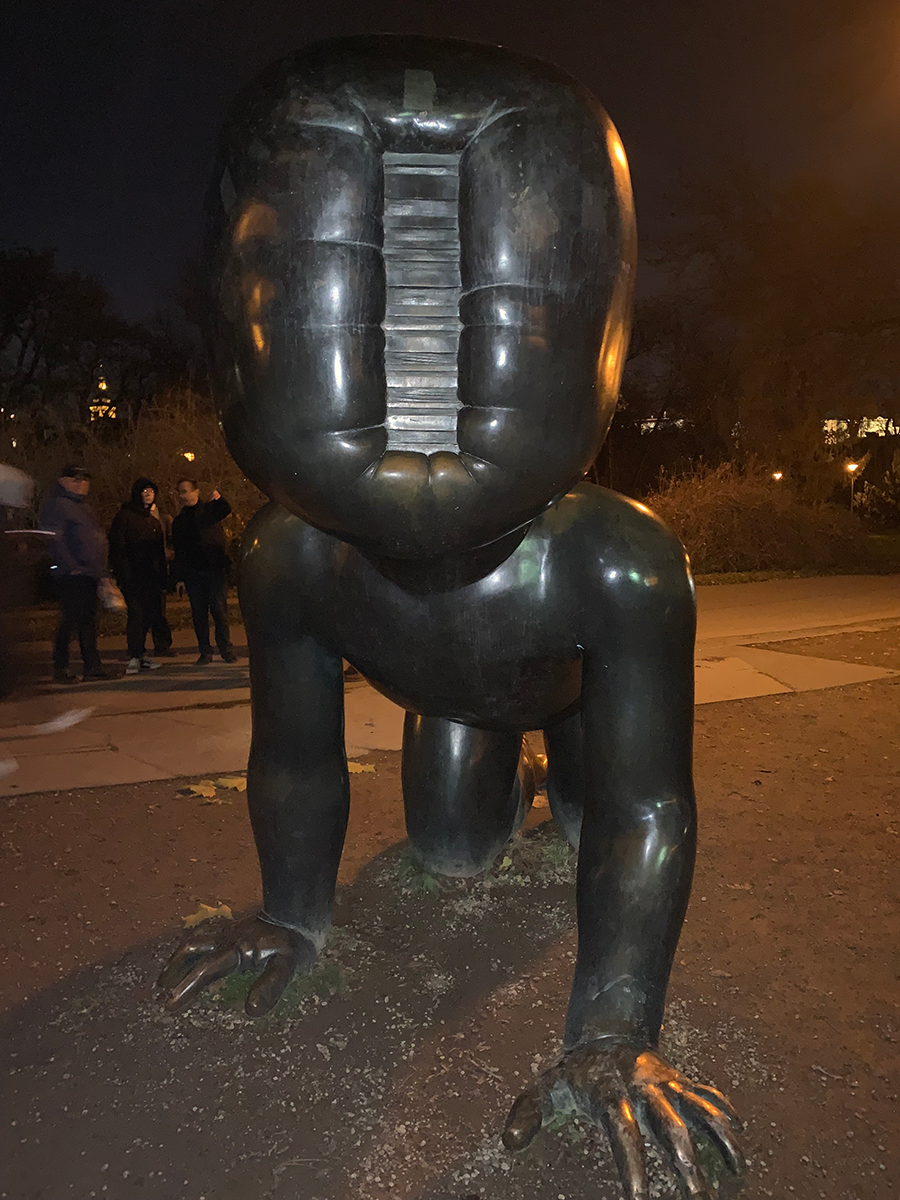 橋を渡ったあと、カンパ博物館の屋外展示(顔にバーコードのついた巨大な赤ん坊のブロンズ像、31章)の前を通る。作中に出てくるものをつぎつぎ確認できて楽しい。