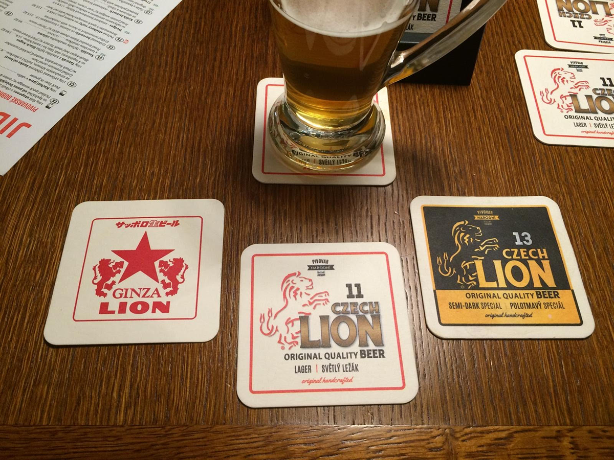 チェコにはこれをコースターのデザインにしている店があり、これは日本の銀座ライオンのコースターと似ているという。10年ほど前に日本に来たときに気づいたそうで、両店のコースターを並べた写真をすぐに送ってくれた(WhatsApp、便利!)。