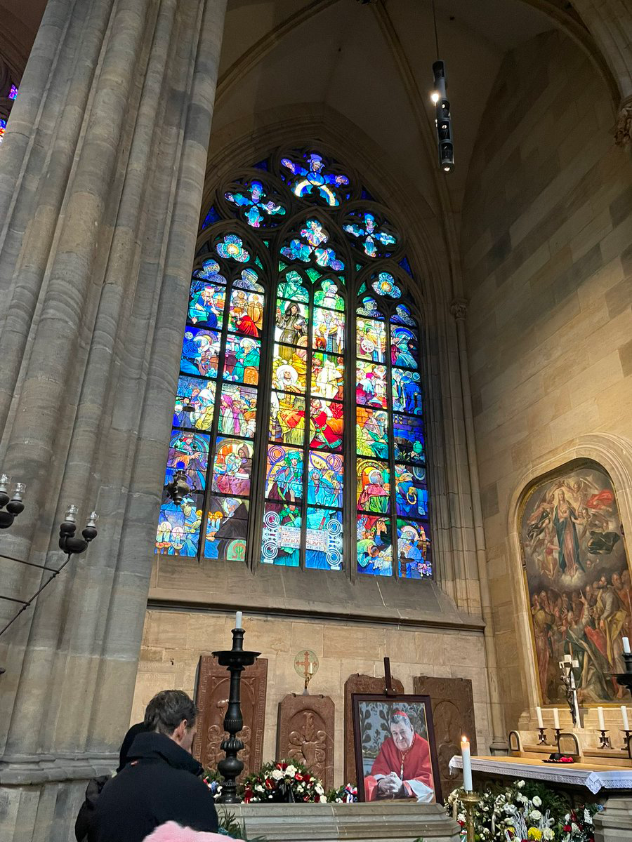 ステンドグラスがたくさん並んでいる。ゴシック風が多いが、ひとつ明らかに趣がちがうものがあった。ムハ(ミュシャ)による作品だ。アマイさんによると、ムハはアメリカからの観光客にはあまり知られていなくて、日本では人気がとても高いとこちらが言ったところ、驚いていた。下の写真は今月逝去したチェコのドミニク・ドゥカ枢機卿のものらしい。