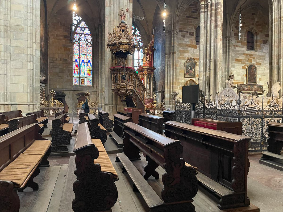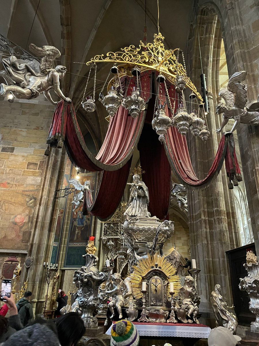 カレル橋にもいたヤン・ネポムスキーの墓がこれ。世界的によく知られた聖人(キリスト教世界では、おそらく最も有名なチェコ人)なので、すごい人だかり。頭の上に5つの星が見えますね。5つもの星が見られるのは、ほかに聖母マリアぐらいだという。