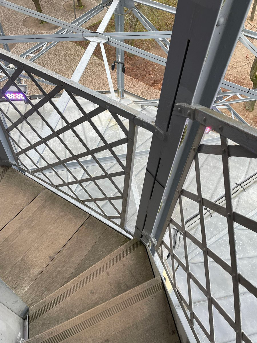 エレベーターでのぼり、展望階から下を見る。クレメンティヌムのときとちがって、ここはむき出しではないから、こわくない。絶景が堪能できる。これまでにまわった場所などを確認していく。 ここでラングドンは、最初はカップルの記念写真などを撮ってやっているが、途中で追っ手が近づいてきたことに気づき、そこからスピーディーな逃走劇が展開する。しかも、いつものことだが、暗号を解きながらだから、忙しくてたまらない。われわれはエレベーターでおりることもできるが、ここはラングドンに倣って、階段を使うことにする(ラングドンは猛スピードで駆けおりたが、われわれはゆっくり歩く)。たぶん、このぐらいの高さでラングドンは飛びおりたはずだが、塔の骨がいっぱい交差していて、危ないんじゃないか。