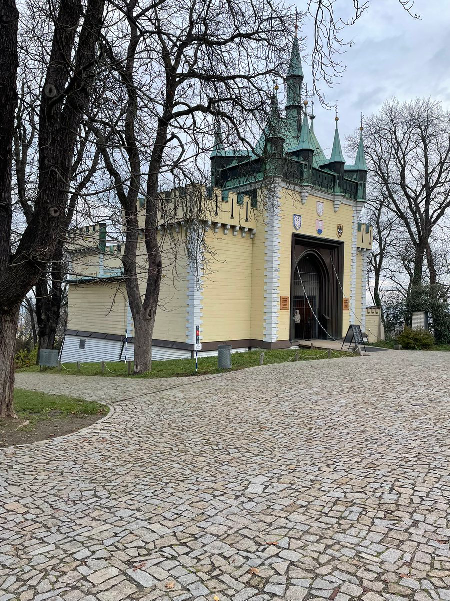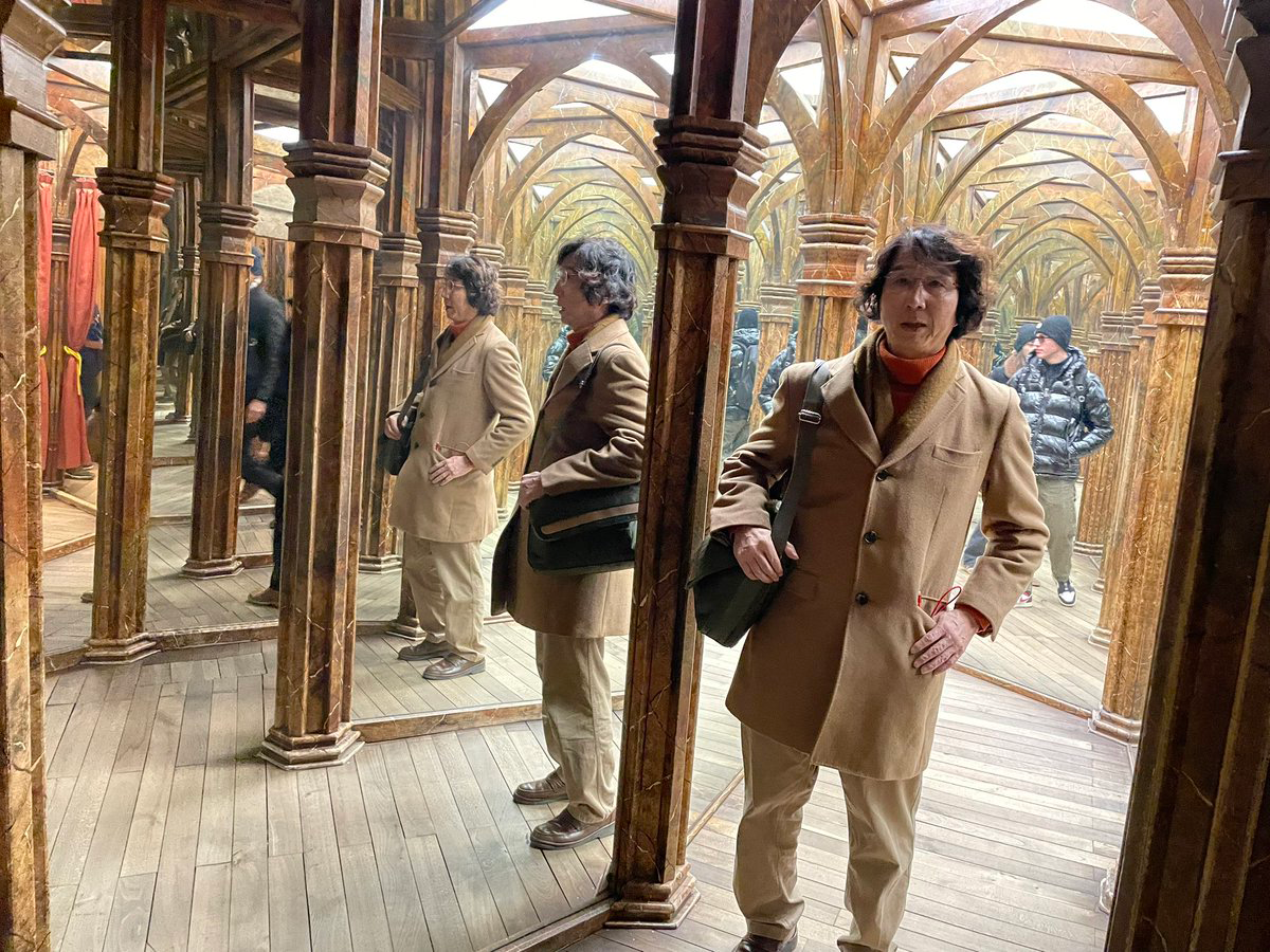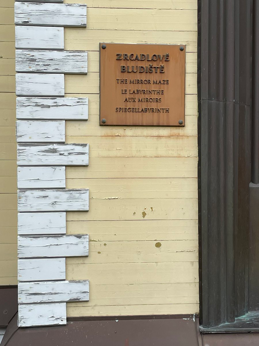 実際には、表の看板はこんな感じ。なんだ、チェコ語の下に英語で THE MIRROR MAZE とはっきり書いてあるじゃないか。でも、この日は霜がべったり張りついていて見えなかったのかもしれない(ということにしておこう)。アマイさんはラングドンの味方だから、字が小さくて見えなかったんだろうと言っている。慈愛に満ちたやさしい人だ。