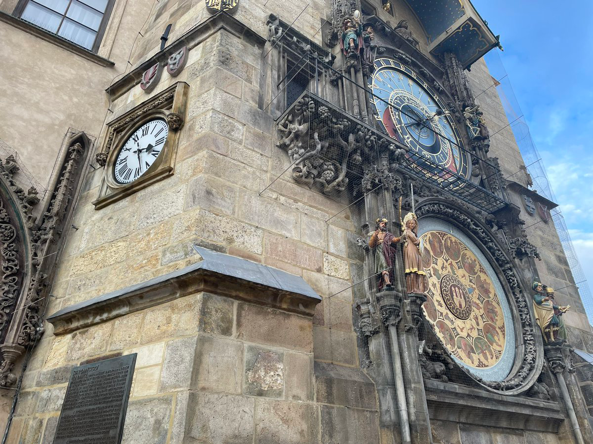 そして、せまい階段をおりて外へ。天文時計の読み方がわからないときは、左にふつうの時計があるので、カンニングすれば簡単にわかります。