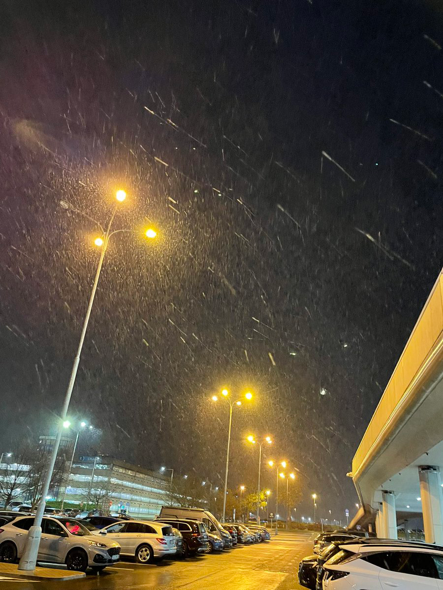 タクシーをおりたら、なんと雪が! 3日間、好天に恵まれて快適にプラハの街をまわれたことに感謝。これはイルカさんからのプレゼントのなごり雪だな。