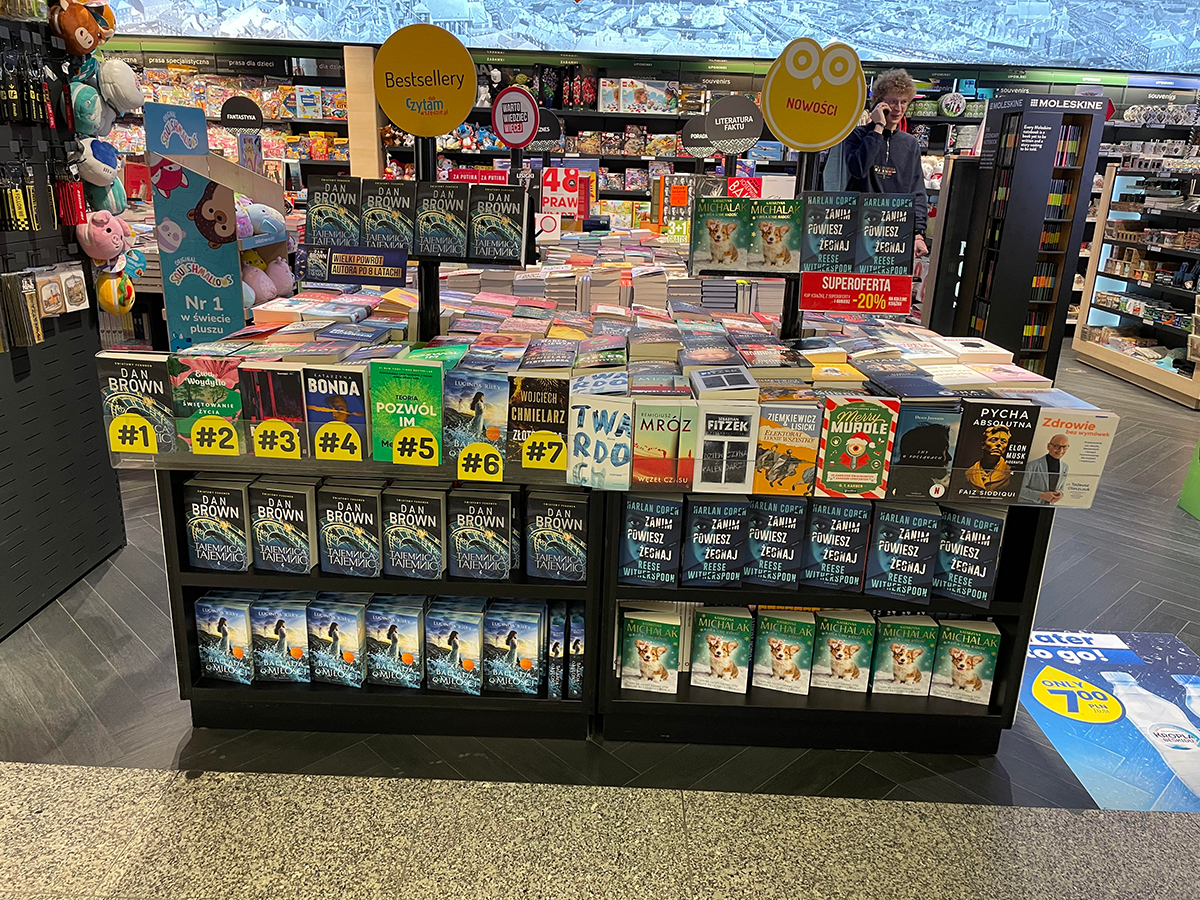 空港内の書店では、われらがSOSがいまもベストセラー1位。ポーランド語版も表紙は天文時計だ。