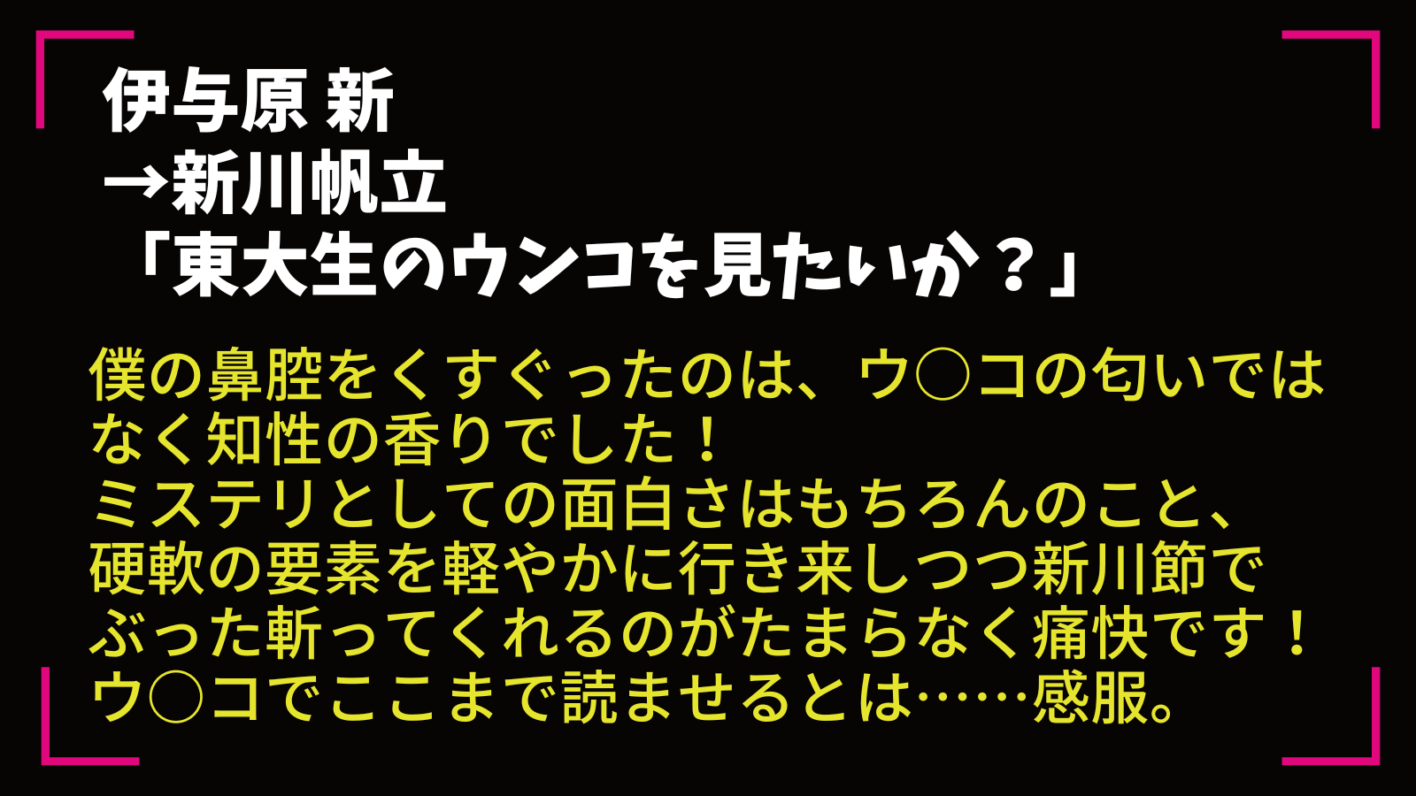 ミステリー作家の新川帆立は、東大で刑法学の准教授を務める友人リリーからある事件の相談を受ける。人糞から飲用水を作る研究をしている農学部の学生が、何者かによって汚物タンクに突き落とされたのだという。さらに事件現場からは、学生が運搬していた人糞が消えていた――。帆立&リリーのコンビはウンコ泥棒の特定に動き出す。