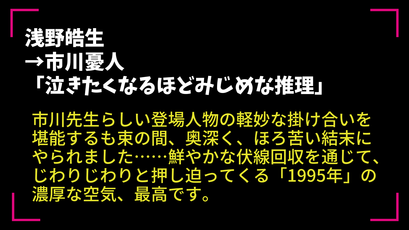 1995年、阪神・淡路大震災が起き、大切な従姉妹・史乃姉さんを喪ったその年に、私は東大に入学した。史乃姉さんの所属していた文芸サークルに加入し半年以上が経つが、彼女と従姉妹であることは会員たちに明かしていない。私しか合鍵を持っていないはずの彼女の部屋に侵入し、本棚一段分の本を丸ごと持ち去った犯人が、きっとこの中にいるからだ。