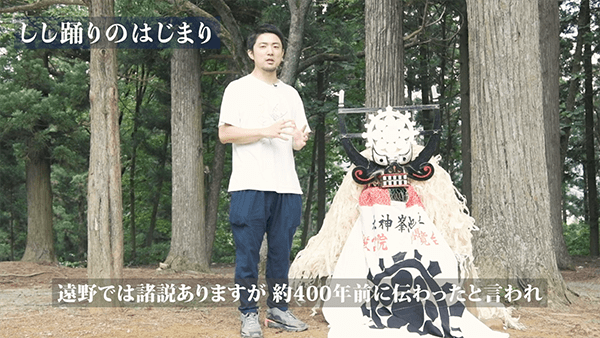 「天神の山には祭ありて獅子踊あり」。若き日の柳田國男は『遠野物語』が発刊される前年の1909年8月に遠野の菅原神社にて、郷土芸能「しし踊り」を目にしています。その様子は『遠野物語』の序文に非常に色彩豊かなに描かれており、彼が ”戦慄” した遠野を代表する風景の一つです。今回映像でご紹介するのは、その時、柳田が実際に目にしたと言われる、遠野市附馬牛町の「張山しし踊り」の紹介と、東北各地に広く伝わるしし踊りについての解説です。もともと鹿など獣の供養から始まったとされ、まるで霊獣のような不思議な外見の”しし”とは一体何者なのか? 張山しし踊り保存会に所属する遠野在住の方自らナビゲーターとなって、分かりやすくお届けします。