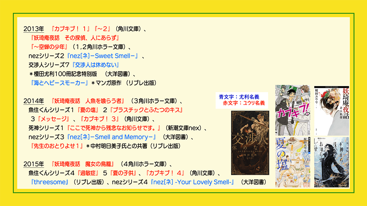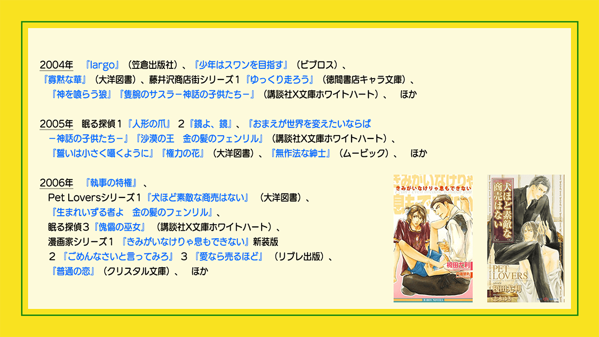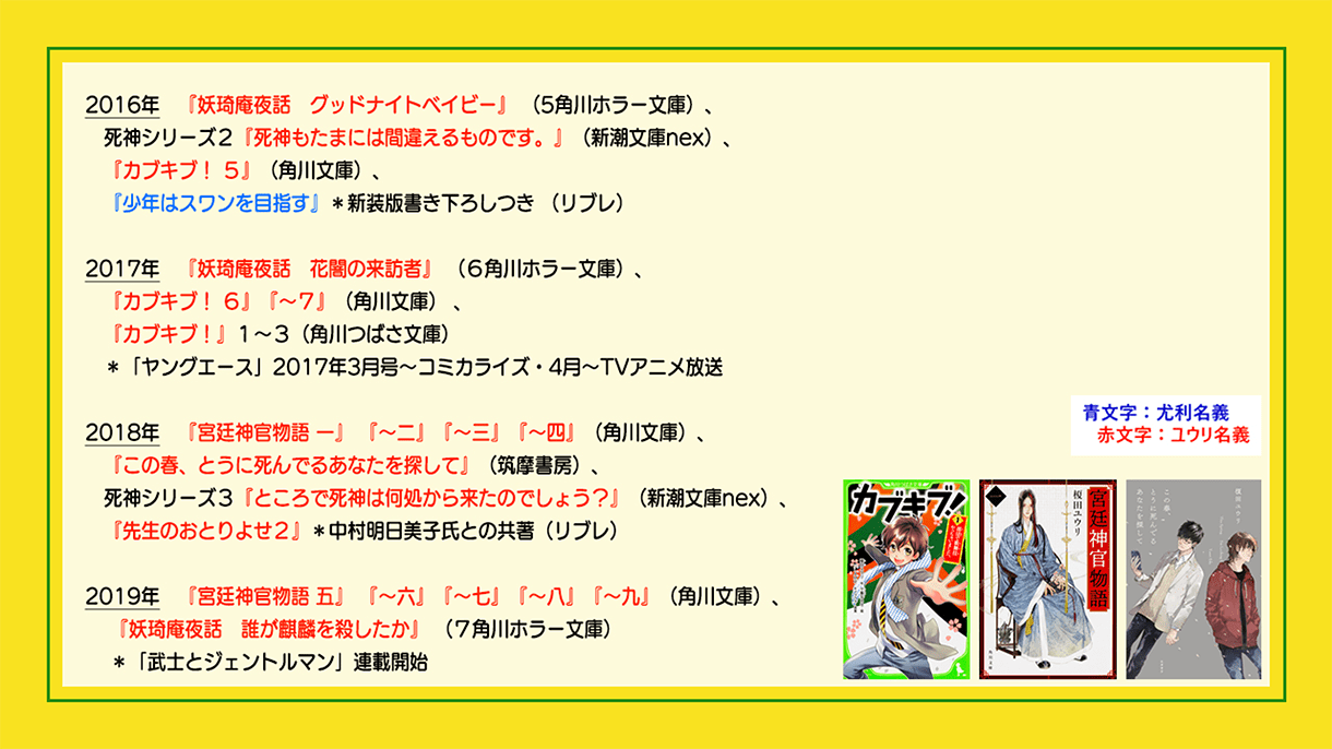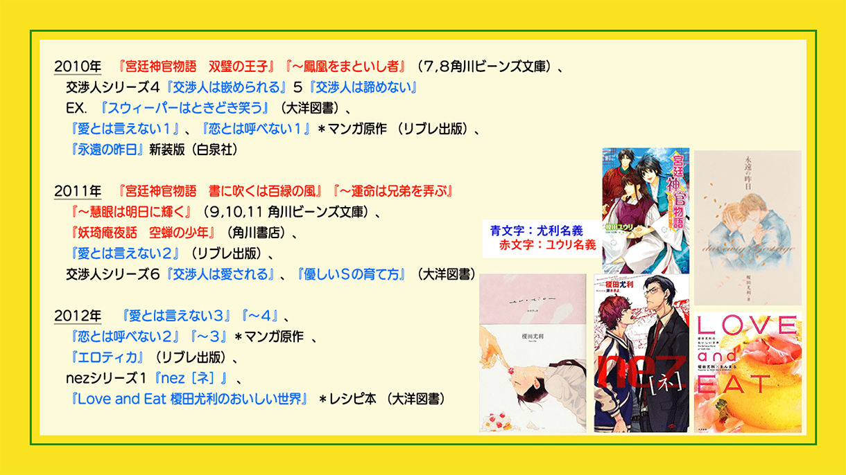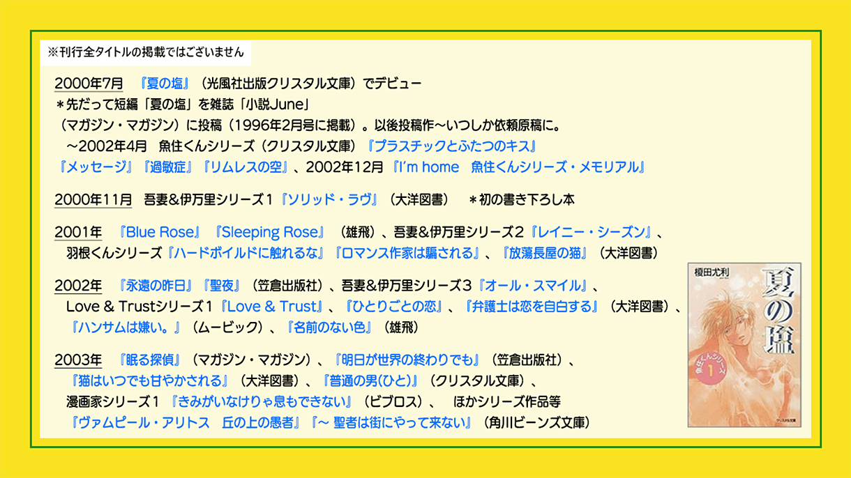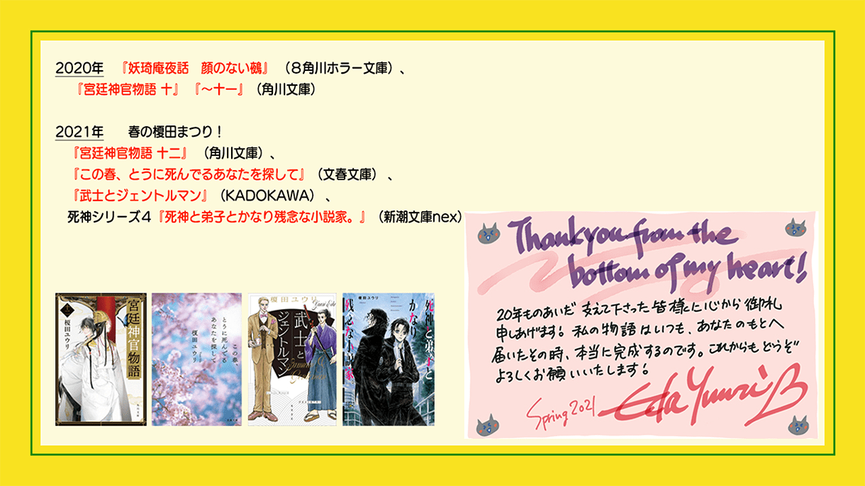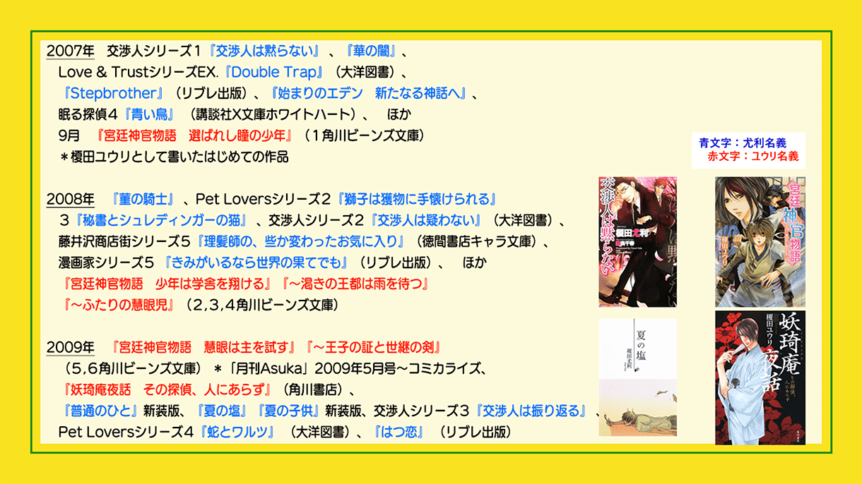 5月21日に開催された「榎田ユウリ 新刊発売&20周年記念イベント」で使用した「榎田ユウリの20年」のスライドを特別掲載!(画像をクリックすると拡大します。)