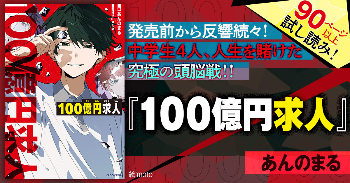 2月7日発売予定、10代から支持の人気作家・あんのまる完全新作『100億円求人』。中学生4人が「闇バイト」に巻きこまれて始まる、最後の一行まで目がはなせない「究極の頭脳戦」。大人たちとのヒリつく心理戦の先にある、あなたの予想をぜったい裏切るどんでん返しに注目です! モニター読者である10代男女から熱烈な感想も届いている期待の一作を、大ボリュームで試し読み公開!