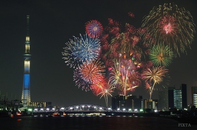 私にとっての隅田川の思い出は、花火大会と切っても切り離せない。子どものころ、毎年家族で見物にいくのが夏休みの最大行事だった。当時は、両国の川開き、と呼んでいた。江戸時代からつづく日本最古の花火大会であり、舟遊びや川面の屋台などの庶民のリクリエーションの場として愛された。この光景を描いた浮世絵が数多く残されている。
