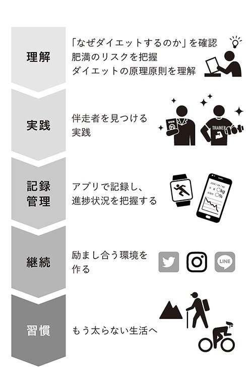 各段階は、実はそれぞれに、科学的な根拠(「エビデンス」と言います)があるものです。したがって、この本を読み、みなさんも自身の生活を少しずつ変えていけば、気づくと結果が出た状態になるはずです。