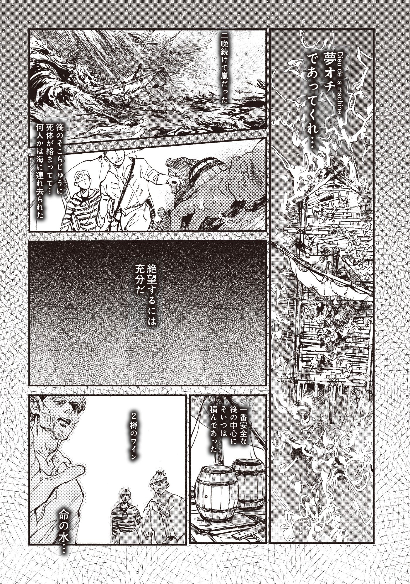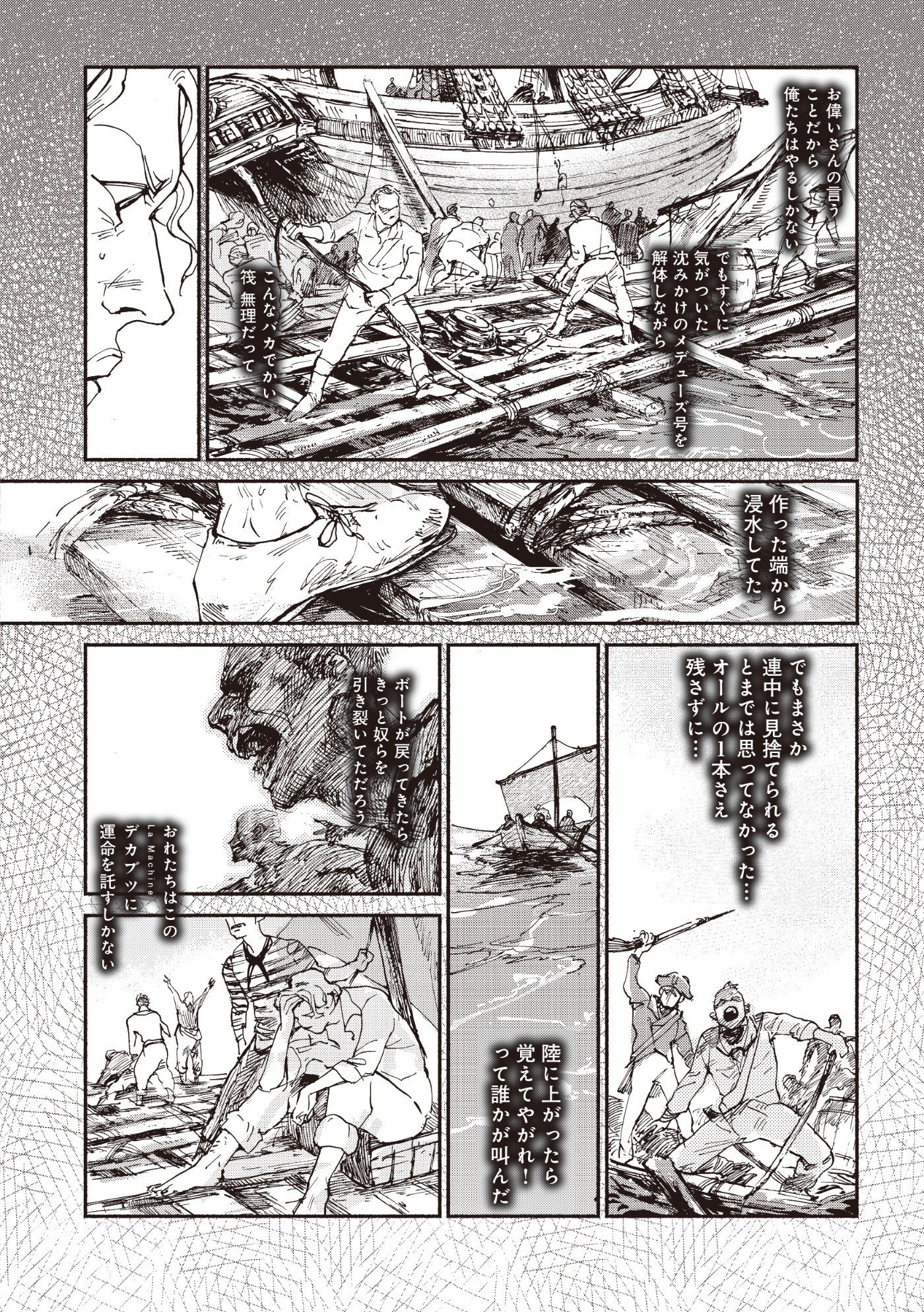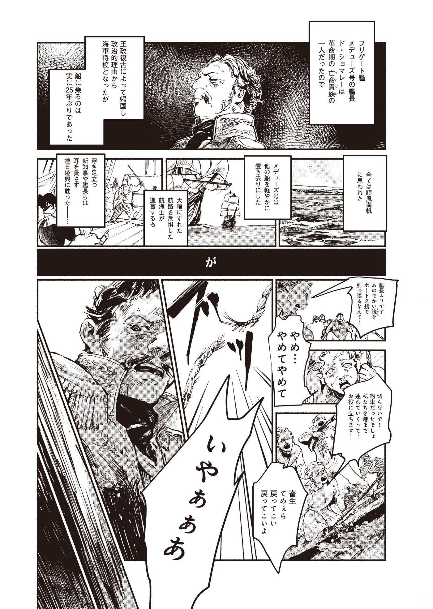 1816年、フリゲート艦“メデューズ号”がモーリタニア沖で座礁する。急ごしらえの救命ボートの筏は150名近くを乗せ13日間漂流したあげく他の船によって発見されたが、生存者はわずか15名にすぎなかった。時のフランス復古王政政府はこの事件をひた隠しにしたが、漂流期間中、筏の上では殺人、食人を含む様々な非人間的行為が行われたことが明るみに出てしまう。ショッキングなこの事件を題材に大作を描きサロンでスキャンダルを巻き起こしたのはテオドール・ジェリコー。彼はいったいこの事件に何を見たのか。「起こったことを精確に描く」ため、死体をアトリエに置き観察するなど常軌を逸した行いに世間は戦慄するが、ジェリコーは人間の本性を暴き出そうとするその真摯なまでの信念に突き動かされていく。19世紀初頭、ロマン主義、印象派などに先駆けて「近代絵画の先駆者」といわれる画家の、人間の本質へと迫る半生を描く。