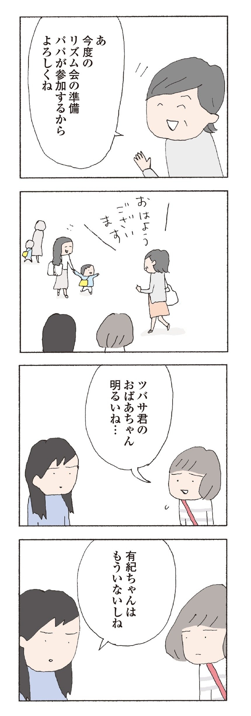 保育園のママたちの間ではその話題で持ち切り。噂では有紀ちゃんは男を作って逃げたということらしい。