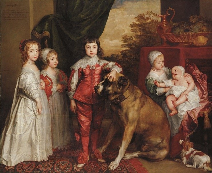 ヴァン・ダイクの『チャールズ一世の子供たち』で、大きなマスチフ犬の頭を撫でていた王太子チャールズ(父と同名。後のチャールズ二世)は、