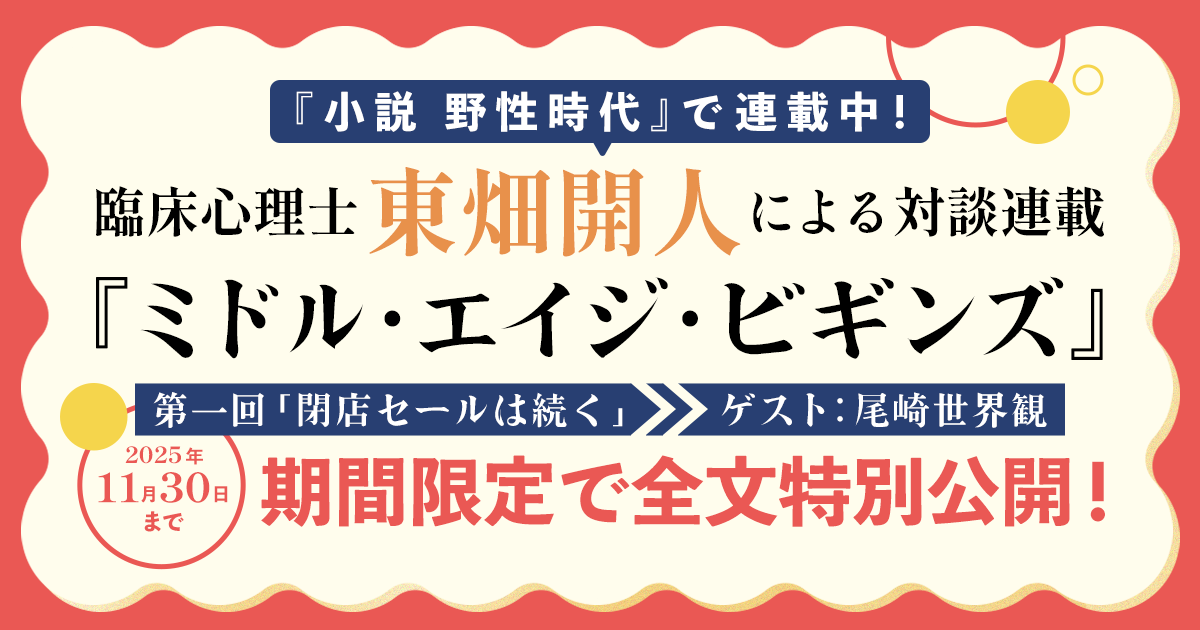 臨床心理士・東畑開人さんがゲストと共に「中年期」について語り合う――対談連載「ミドル・エイジ・ビギンズ」が、電子雑誌『小説 野性時代』に登場!