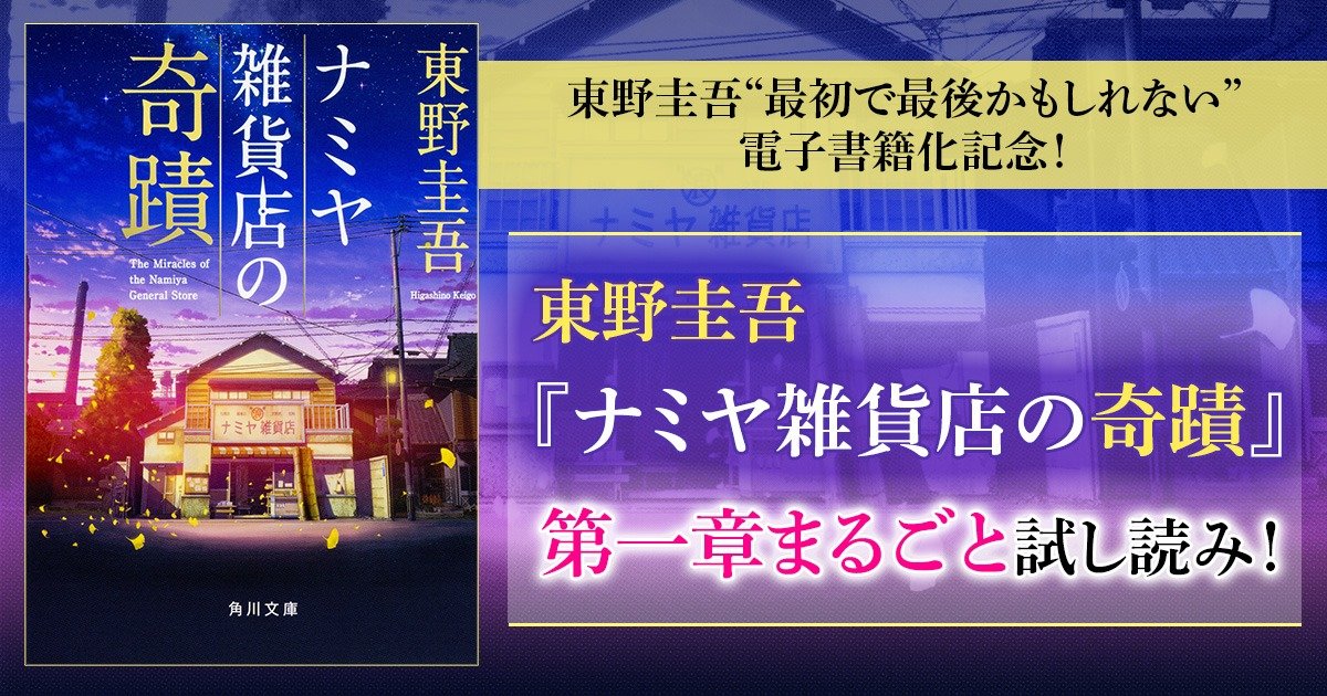 これまで著書の電子化をしてこなかった東野圭吾氏が、ついに電子書籍の配信をスタートすることになりました。それに合わせてカドブンでは、記録的ベストセラーとなった『ナミヤ雑貨店の奇蹟』の第一章をまるごと試し読み公開します!