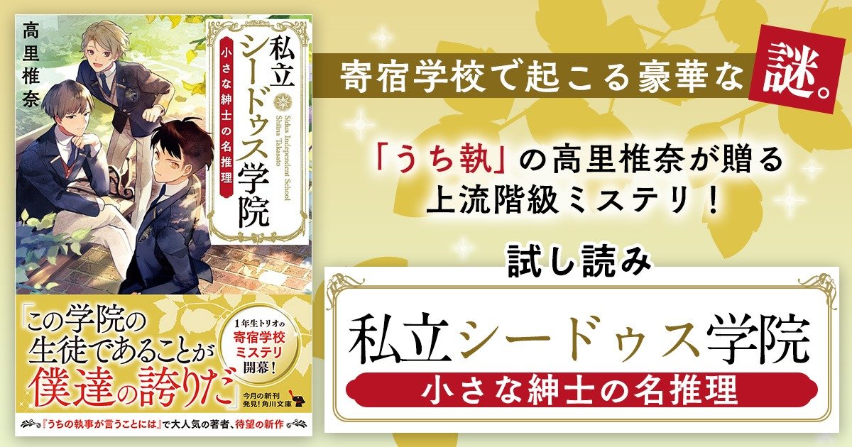 「薬屋探偵」「うち執」などで大人気の作家・高里椎奈さん。待望の新作『私立シードゥス学院 小さな紳士の名推理』は、全寮制の学院を舞台に仲良し1年生トリオが謎を解く寄宿学校ミステリです。10月23日の発売を前に、カドブンでだけ特別に新作の序話を配信いたします!